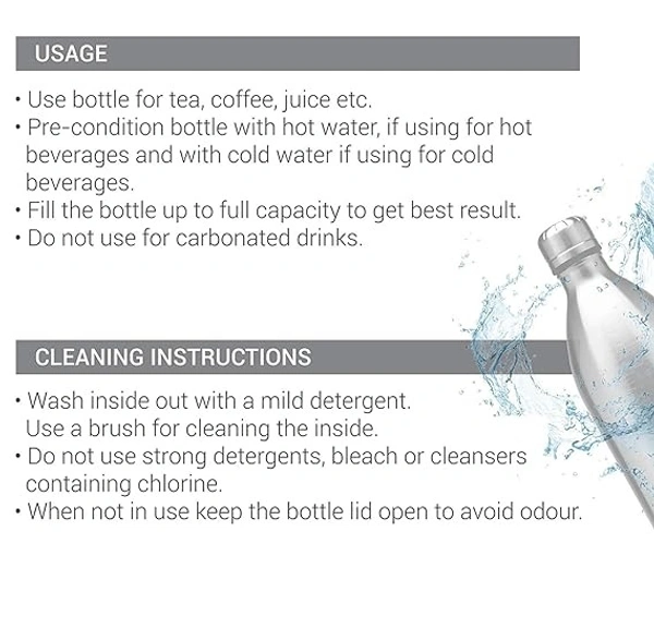 - Color: Silver; Material: Stainless Steel; Package Contents: 1 - Piece Duo Dlx Thermosteel Water Bottle (1 Litre); For any queries kindly reach customer care number as mentioned on the product packaging along with the proof of purchase.