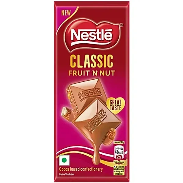 Indulge your taste buds with the irresistible NESTLE CLASSIC FRUIT-N-NUT, brought to you by My Basket. This sumptuous chocolate bar is a perfect harmony of creamy milk chocolate, luscious fruits, and crunchy nuts, making every bite an unforgettable experience.