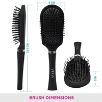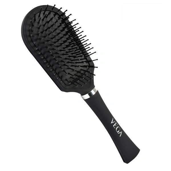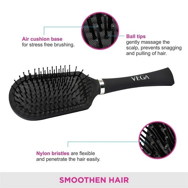 he VEGA Cushion Brush (E5-CB) is perfect for grooming, smoothing, and straightening hair along with enhancing its shine. Cushioned nylon bristles with ball ends that remain in place easily enter the hair to stimulate and massage the scalp. This kind of bristle also helps to minimise snags and tangles in the hair. It has a lengthy handle in comparison to other types of hair brushes. Suitable for all types of hair extending from short to medium length.