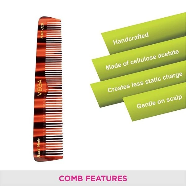 VEGA Handcrafted Combs are made from cellulose acetate which do not create static charge in hair due to its non-petroleum based material, which is derived from natural plants. It has smooth rounded teeth which do not hurt your scalp while combing and helps to reduce hair fall. It is gentle on the scalp and ideal for sensitive skin and helps to create styles while adding lustre